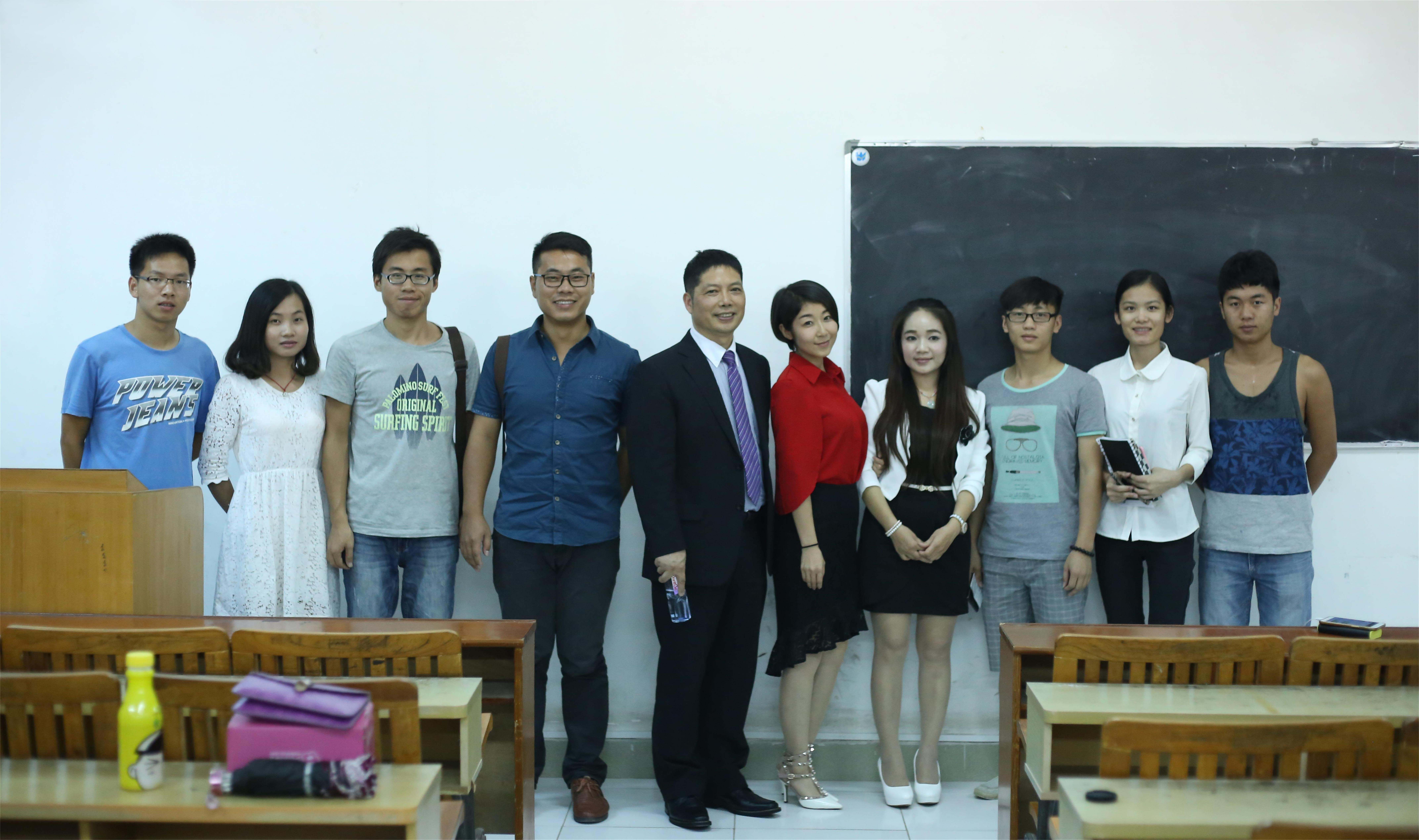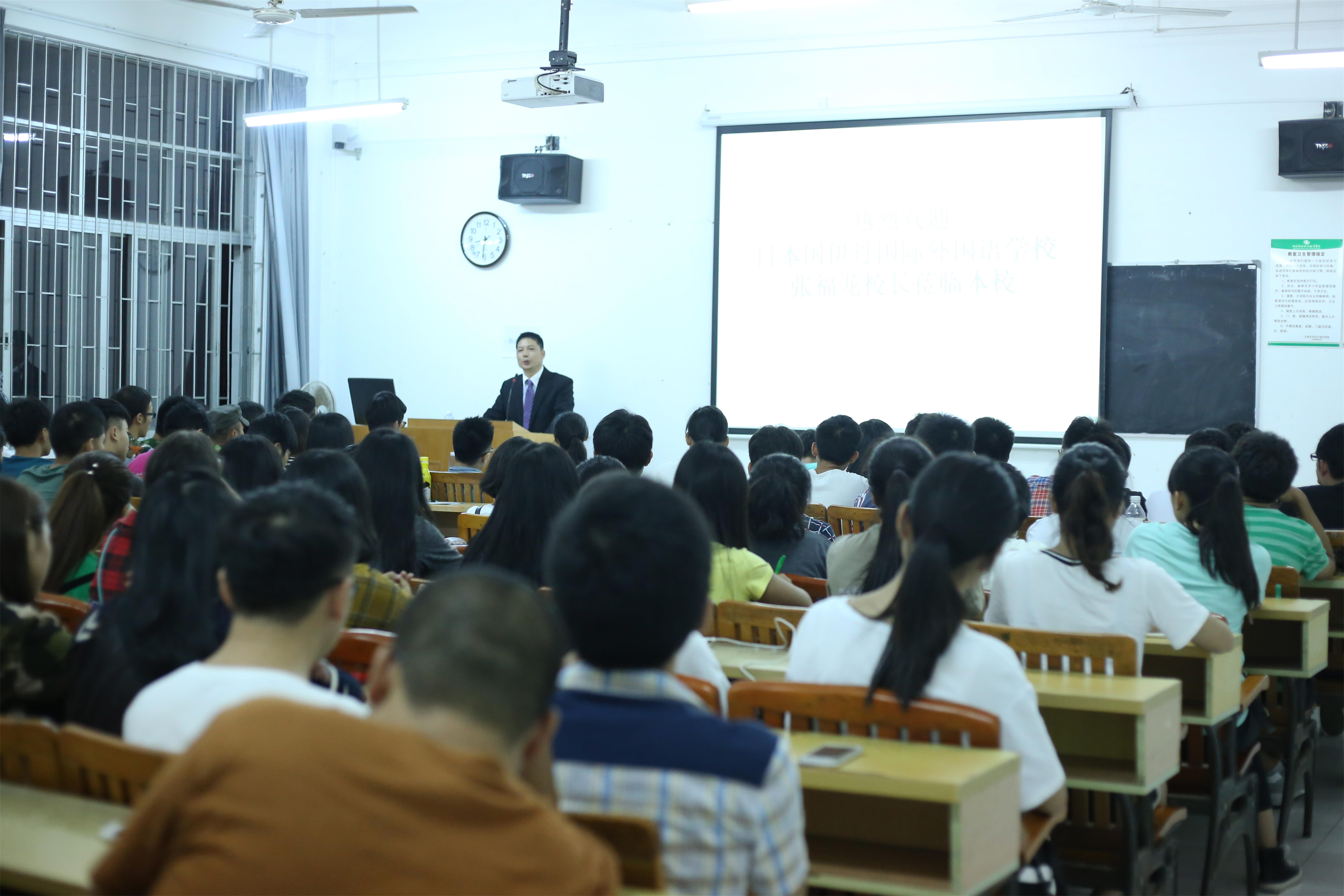 2015年10月18 日晚,日本伊丹国际外语学校张福龙校长受邀到我院开展一场关于他自己人生的讲座。到场的领导老师有团委书记杜博、社联潘建荣老师以及学院32个社团的代表。本次讲座座无虚席,同学们对这位有着“传奇”色彩的人物充满着期待。