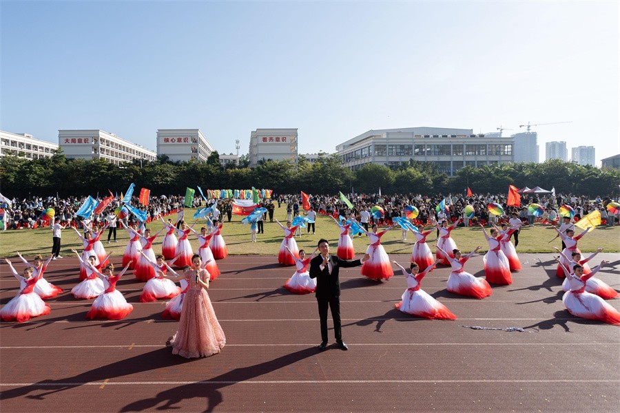 学校校长卢新华为开幕式致辞,他表示,“体育强则中国强,国运兴则体育兴”。一直以来,学校以培养德智体美劳全面发展的社会主义建设者和接班人为己任,全面贯彻党的教育方针,坚持“以体育智”“以体育心”,强化“天天锻炼、人人健康”意识,引导学生形成终身锻炼习惯和健康生活方式,在体育锻炼中增强体质、健全人格、锤炼意志。近年来,学校体育工作不断取得显著成效。目前,学校成立了体育类社团20余个,形成了人人参与体育锻炼的良好风尚。学校近三年在全国、全区赛事中我校屡创佳绩,共荣获自治区级以上荣誉奖项41项,其中包括16项国家级奖项。今年6月,学校又获“第三届广西壮族自治区学生运动操舞锦标赛暨体育艺术类课程教学成果展示赛”4项冠军和1项季军的佳绩。他鼓励广大师生通过体育运动锤炼意志,培养团结协作、勤奋向上、不怕苦累、敢于挑战的优秀品格,练就强壮的体魄,在运动中释放压力、享受乐趣、增强体质、感受美好生活,为一生幸福打牢健康基础。他希望全体参赛师生发扬“参与、拼搏、公正、友谊”的精神,遵守比赛规则,团结协作,顽强拼搏,赛出风格,赛出水平,赛出友谊,推动学校体育再上新的台阶。