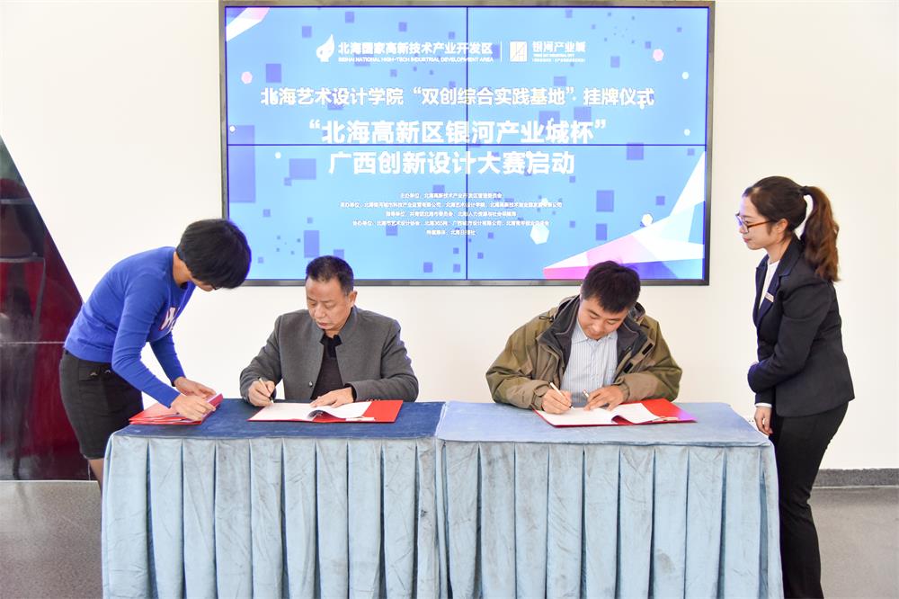 北海高新技术产业开发区管委会、北海艺术设计学院、北海人力资源与社会保障局、共青团北海市委员会的相关负责人,还有我院的师生们共同参加了北海艺术学院双创综合实践基地挂牌仪式暨“北海高新区银河产业城杯”广西创新设计大赛启动仪式。