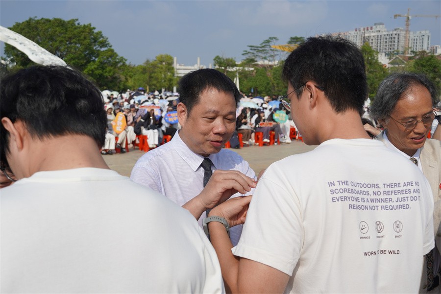 典礼现场,温情与仪式感交织。学校领导及教师代表亲手为新生代表佩戴上北海艺术设计学院校徽。小巧的徽章,不仅镌刻着学校的耕耘与坚守,见证着学校从步履铿锵到风华正茂的成长轨迹,更承载着学校对新一代学子的殷切期许——盼他们以更敏锐的艺术感知力捕捉生活之美,以更独到的审美观察力洞察世界之趣,在艺术求索之路上拓宽眼界、涵养格局,把北艺精神代代赓续、脉脉相传。当校徽稳稳缀于胸前,新生们从此赓续北艺传统,共沐校园荣光,以徽章为证,开启属于自己的艺术新程,也为北艺的故事续写新的璀璨篇章。