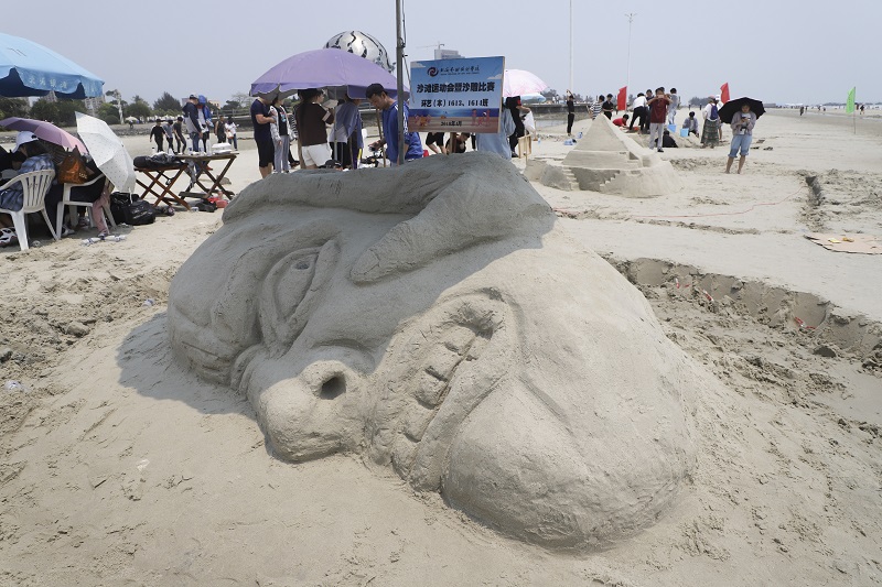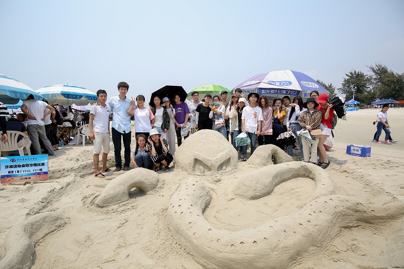 各项比赛在激烈的角逐,第十四届沙雕比赛与此同时也在进行中。在炎炎烈日下,参赛师生们展开丰富的想象,将精湛的沙雕艺术与大家喜闻乐见的卡通形象相结合,增添学院文化风采。沙雕大赛不仅成为我校的传统活动之一,还是北海银滩景区一张靓丽的名片,吸引许多游客驻足观看。