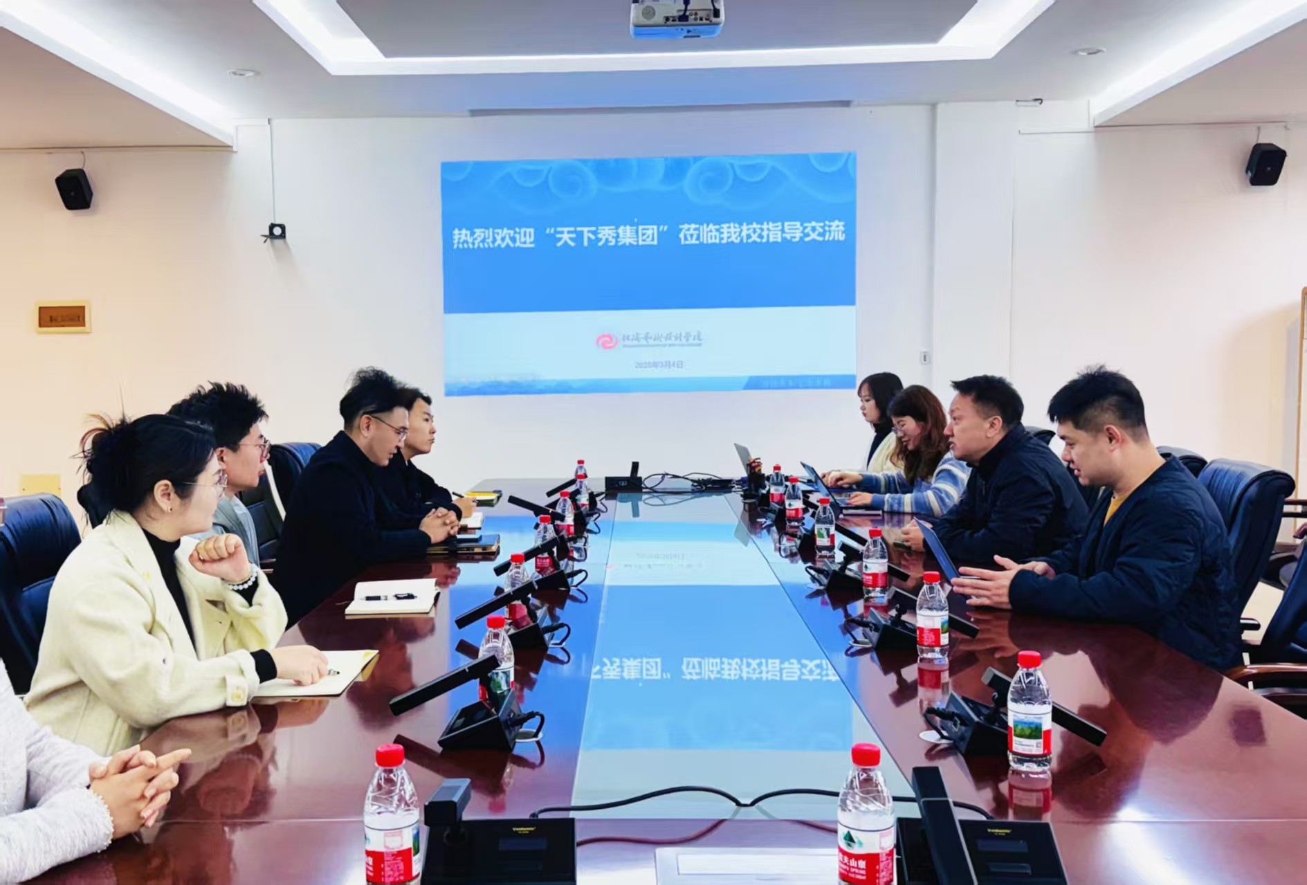 3月4日,天下秀数字科技(集团)股份有限公司海外事业部总经理王翔一行莅临我校,围绕毕业生就业合作、实习基地建设、产学研协同育人等核心议题开展座谈交流。学校副校长邱杰,教学质量监控与评估中心主任孙竹青,招生就业处全体成员,设计艺术学院、影视动画学院与传媒艺术学院相关负责人参加座谈。