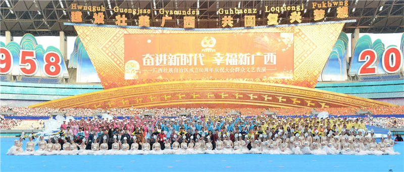 庆祝大会进行了主题为《奋进新时代 壮美新广西》的群众文艺表演,来自广西14个地级市各具代表性的文艺演出为全世界奉献了一场精彩的八桂文化盛宴。56个民族、社会各界的三万多名群众欢歌同聚一堂,歌唱壮美新广西、讴歌伟大新时代。