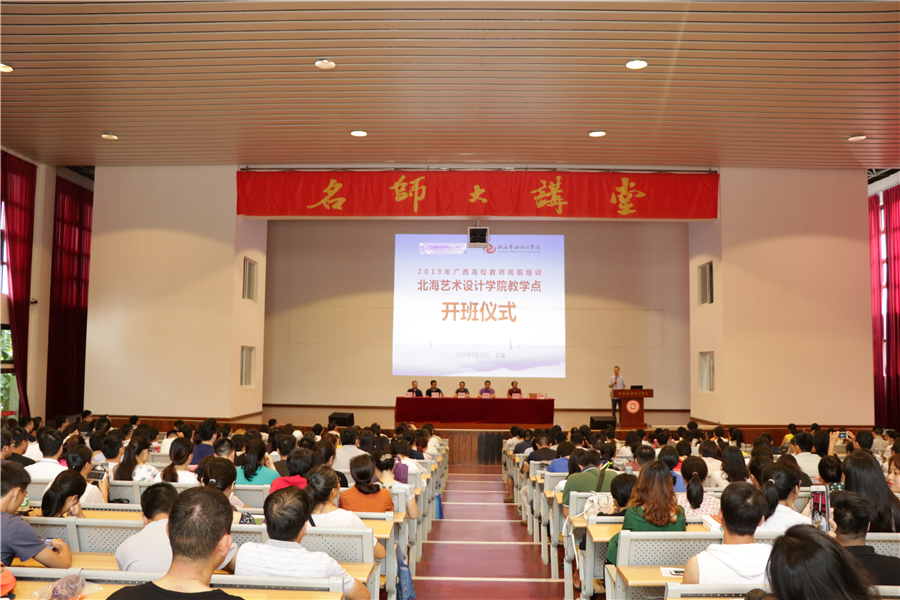 7月16日,“2019年广西高校教师岗前培训北海艺术设计学院教学点开班仪式”在我校礼堂隆重举行。广西高等学校师资培训中心伍尚海专职副主任、授课教师、参培学员及我校有关负责同志参加了开班仪式。开班仪式上,张建虹副校长代表学校对广西高等学校师资培训中心领导、授课教师及学员的到来表示热烈欢迎,对广西高等学校师资培训中心、授课教师和学员给予我校的信任和支持表示感谢,并从学校建设、学科设置、办学成果等方面简要介绍了我校的办学成效。广西高等学校师资培训中心伍尚海副主任对我校教学点的准备工作给予了充分肯定,要求学员们自觉服从管理,遵守学习纪律,认真上课听课,切实提高学习效果。