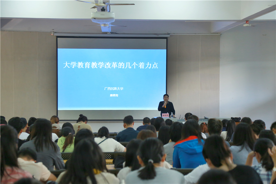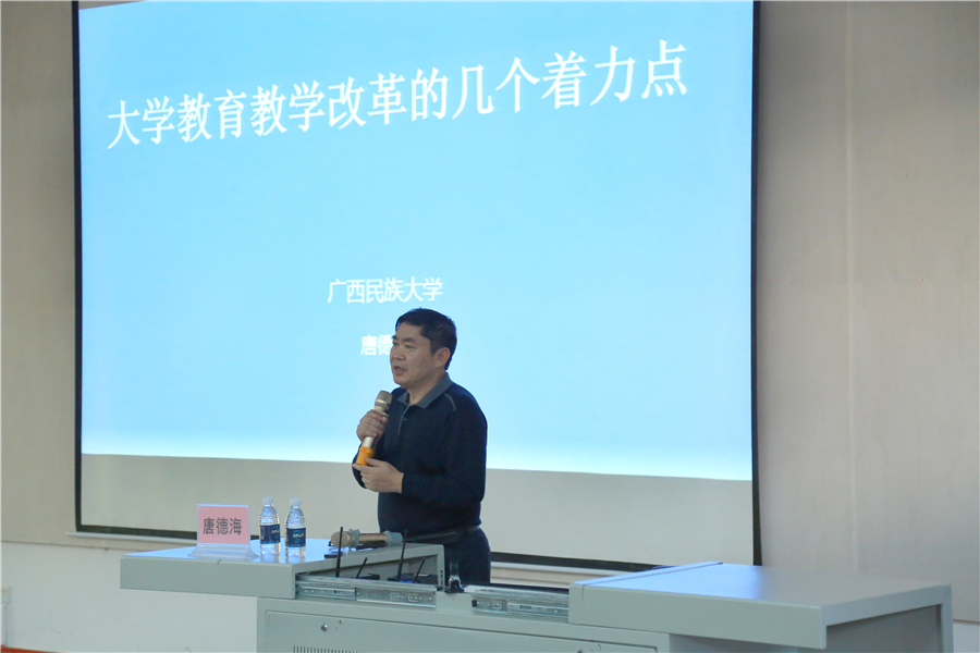 2019年11月5日,广西民族大学唐德海教授应邀为我校全体教师做了题为《大学教育教学改革的几个着力点》的学术讲座。