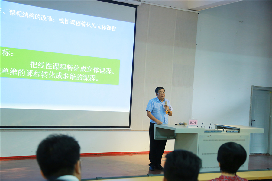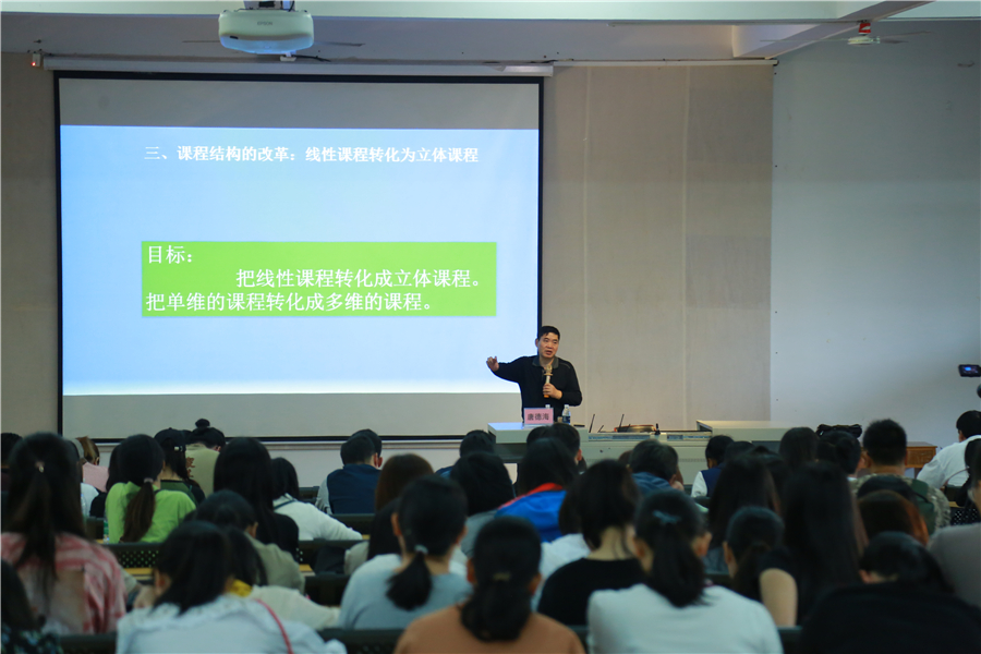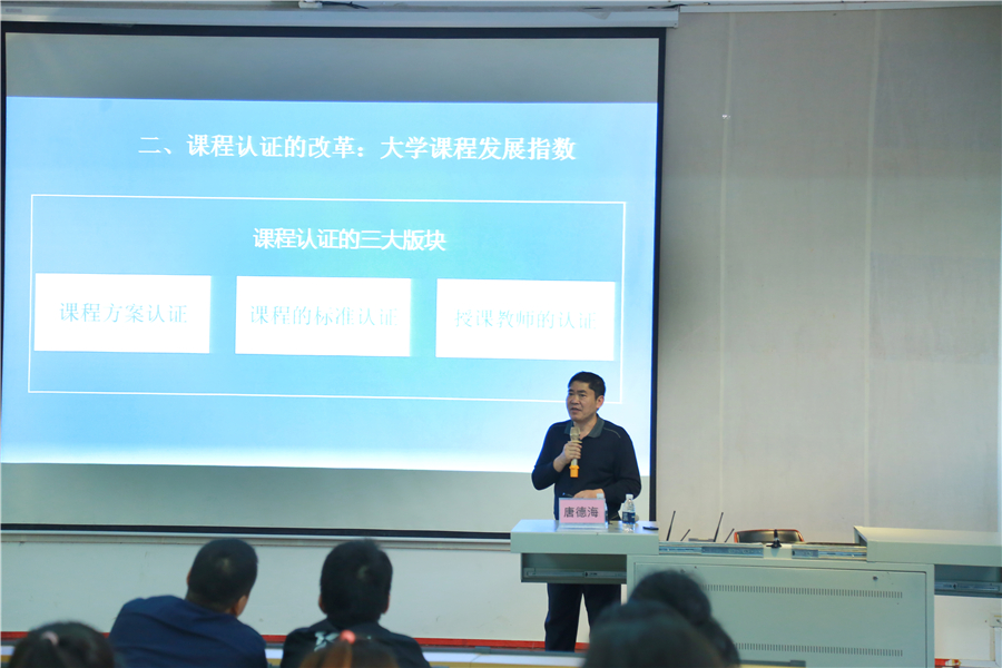 讲座中,唐德海教授主要从三个方面予以展开。一是课程生成改革应将科研优势转化为人才培养优势,大学课程应考虑社会发展需要、学科发展需要、人发展需要三个方面,详细阐述了大学课程生发的四境七态;二是从课程方案认证、课程的标准认证、授课老师的认证三个方面阐述了如何开展课程认证改革;三是课程结构改革的目标应该将线性课程转化为立体课程,把单维的课程转化成多维的课程。每个方面唐教授都结合具体事例予以展开,深入浅出、形象生动,受到全体教师的一致好评。