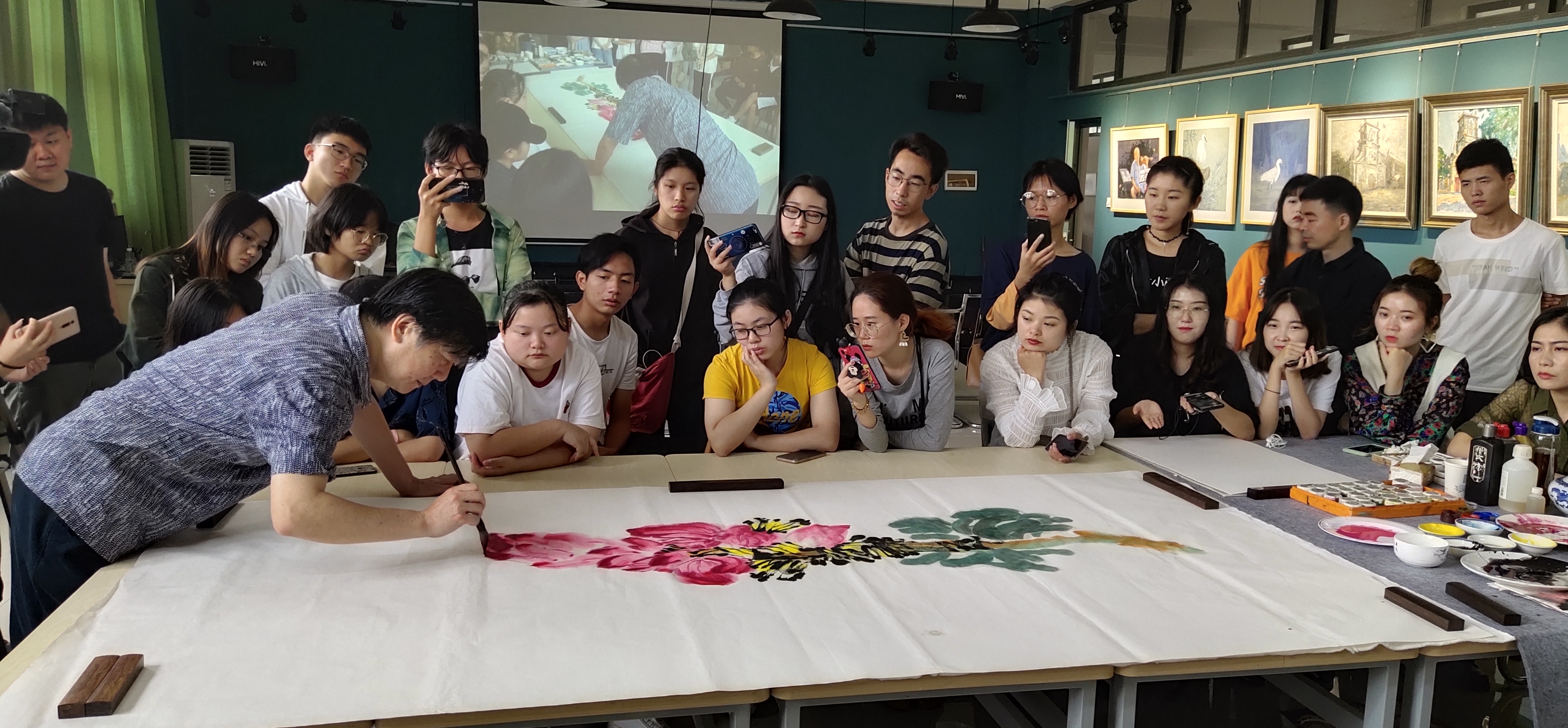 2019年11月17日上午,广西艺术学院艺术研究院副院长蔡智教授来到我校美术学院艺术楼313,为师生们进行国画现场创作示范。我校副校长胡胜、美术学院常务副院长龚为陪同出席活动,现场吸引了许多师生前来观摩学习。