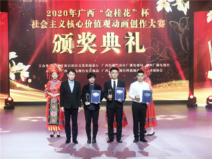 近日,2020年广西“金桂花”杯社会主义核心价值观动画创作大赛颁奖典礼在广西广播电视台演播厅举行。自治区文化和旅游厅党组成员、副厅长唐正柱,自治区广播电视局党组成员、副局长吴晓丽,广西广播电视台副总编辑郑葵等主办方代表出席了颁奖典礼。我校动画学院常务副院长陶立阳、动画学院副院长孙永辉受邀参加颁奖典礼。