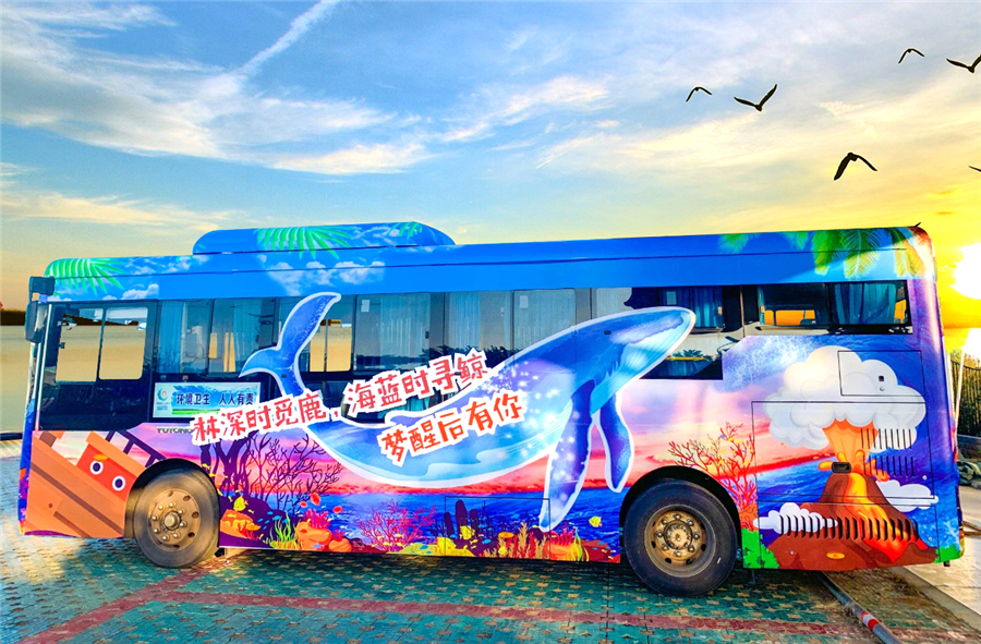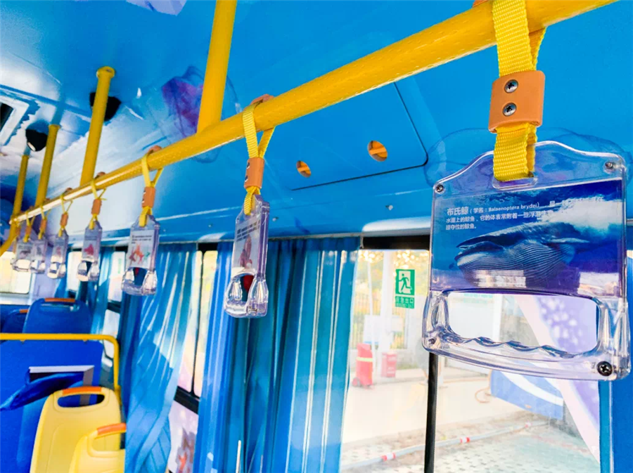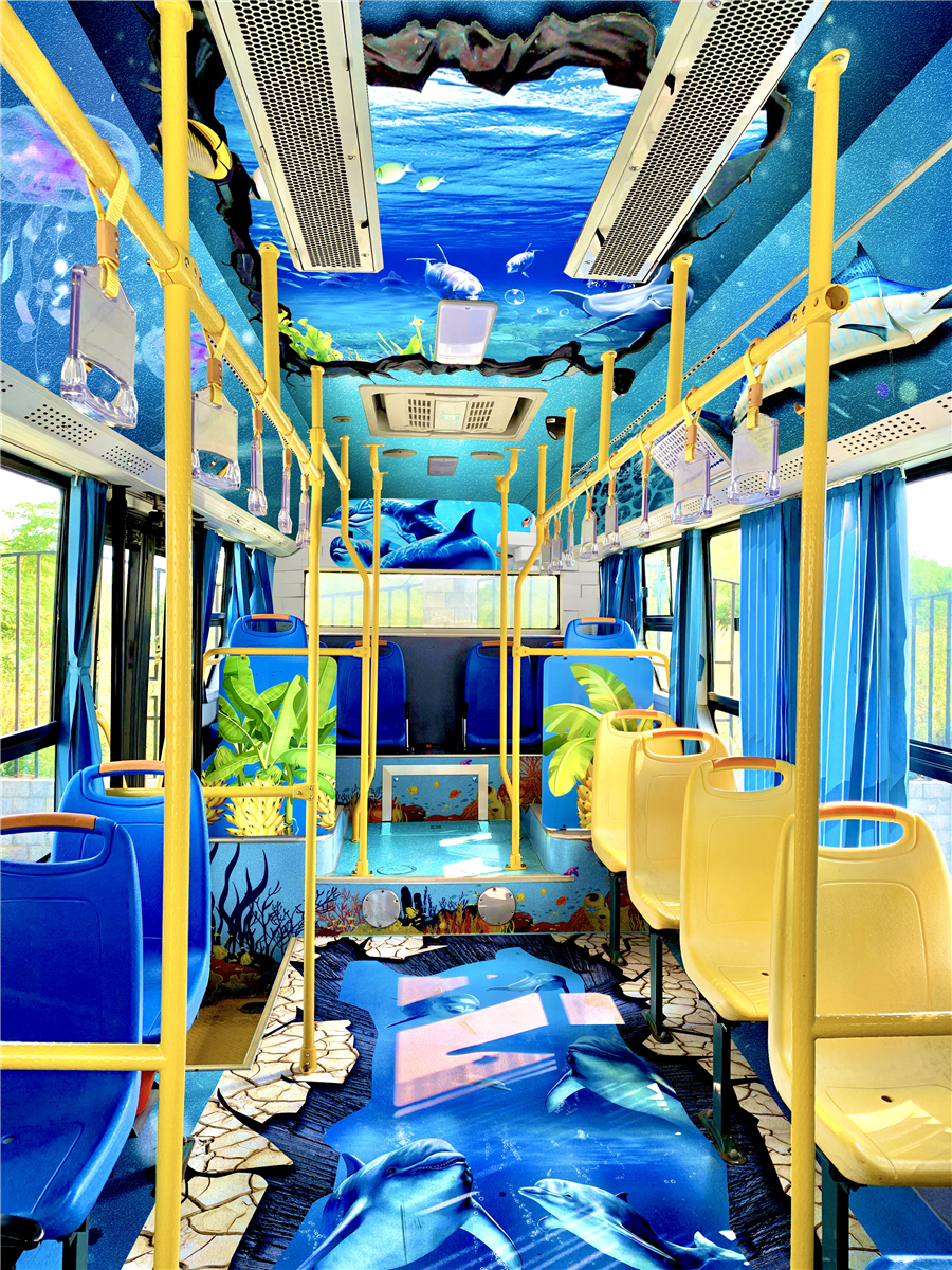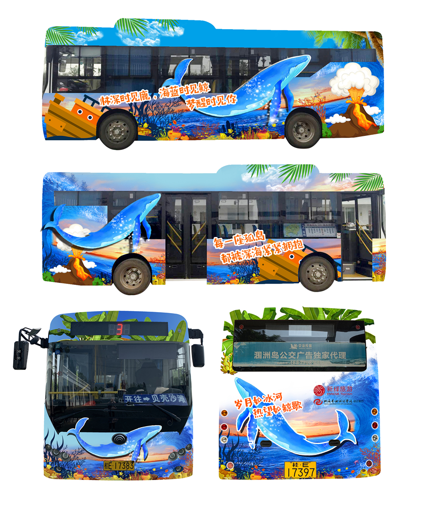 鲸鱼主题公交的车身设计以布氏鲸为核心,车身外用火山、珊瑚、海浪、帆船等海岛元素围绕,车内采用3D画面,立体感十足,给人身临其境的体验感,意趣盎然,承载着游客无数的回忆和故事,让乘客在感受美好生活的同时,践行绿色出行,也让游客实地的感受一场视觉盛宴,倡导市民游客养成文明乘车的习惯。