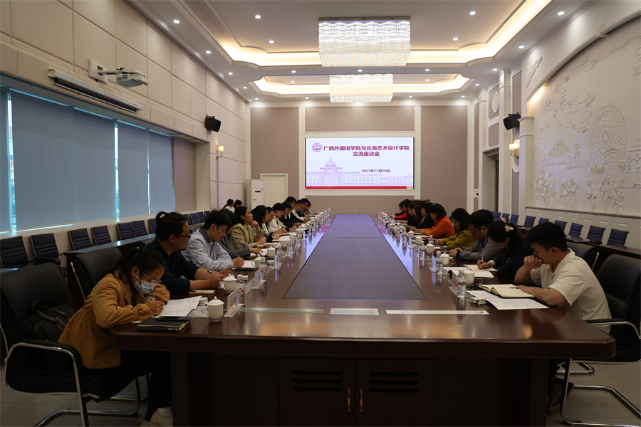 下午,张阳书记一行来到广西外国语学院进行交流学习。广西外国语学院党委书记周江煜对张阳一行的到来表示热烈欢迎,并就学校面向东盟的国际化办学特色和以“十个一工程”为抓手的党建创新做法和模式进行了重点介绍。她表示,作为民办高校,广西外国语学院和北海艺术设计学院在党建工作中遇到的问题和困难存在很多共性,希望两校加强沟通,相互学习,互通有无,共同推进民办高校党建工作再上新台阶。张阳表示,广西外国语学院党建工作亮点突出,做法创新、成效显著,党建工作方面有很多值得学习借鉴的地方,希望双方深入交流和合作,共同探讨民办高校办学模式和党建工作特色,携手为广西民办教育事业发展做出更大的努力。现场,双方还就党建考核机制、课程思政建设、党建品牌打造、师风师德建设等方面进行了交流探讨。