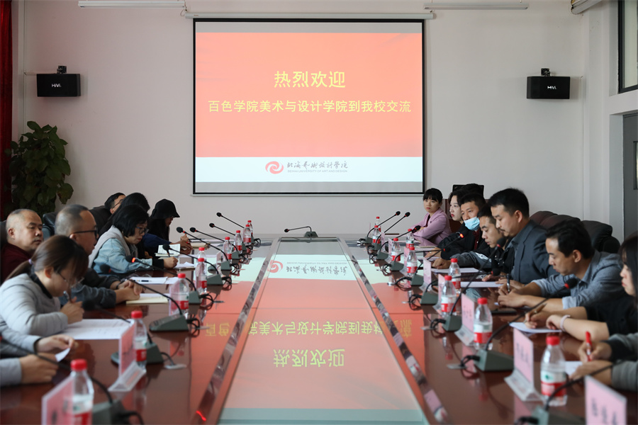 11月26日下午,百色学院美术与设计学院一行到我校进行参观交流,于西校区图书馆505会议室召开座谈交流会。百色学院美术与设计学院党委书记文超武、院长杨帆、副院长张晓帆,我校设计艺术学院院长李林平、第一党总支书记黄锦、副院长白建强等参加了座谈交流会。