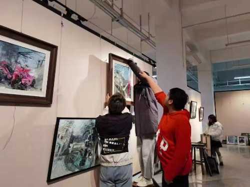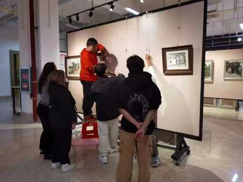 美术学院学工办组织学生进行会议内容,传达上级的工作要求,并按照人数进行分组,强调工作内容(时间段分配上午8:00-10:00、中午11:00-12:00、下午16:00-18:00、晚上19:00-21:00)分组人员与值班布展时间段,及工作要求)。