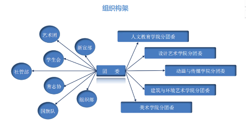 学校团委设组织部、社管部、新媒体宣传部、学生会、青年志愿者协会、学生艺术团、国旗队等7个工作部门;设5个学院分团委(人文教育学院分团委、设计艺术学院分团委、动画与传媒学院分团委、建筑与环境艺术学院分团委、美术学院分团委);并下辖基层团支部358个,学生社团56个。根据组织设置和工作需要配备团务工作人员,目前全校团务干部13人。