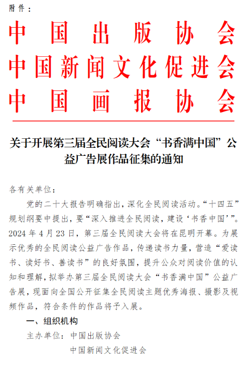 为展示优秀的全民阅读公益广告作品,传递读书力量,营造“爱读书、读好书、善读书”的良好氛围,提升公众对阅读价值的认知和理解,由中国出版协会、中国新闻文化促进会、中国画报协会联合主办的第三届全民阅读大会“书香满中国”公益广告展现面向全国公开征集作品,全民阅读主题优秀海报、摄影及视频作品等符合条件的作品将予入展。现将活动相关事宜通知如下: