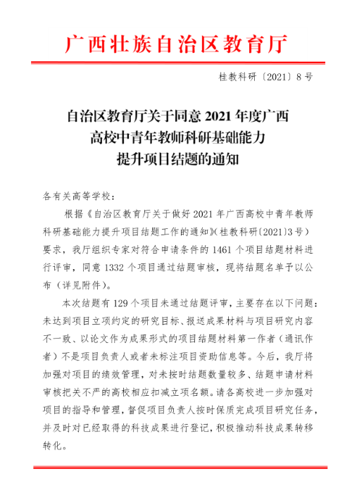 自治区教育厅关于同意2021年度广西高校中青年教师科研基础能力提升项目结题的通知