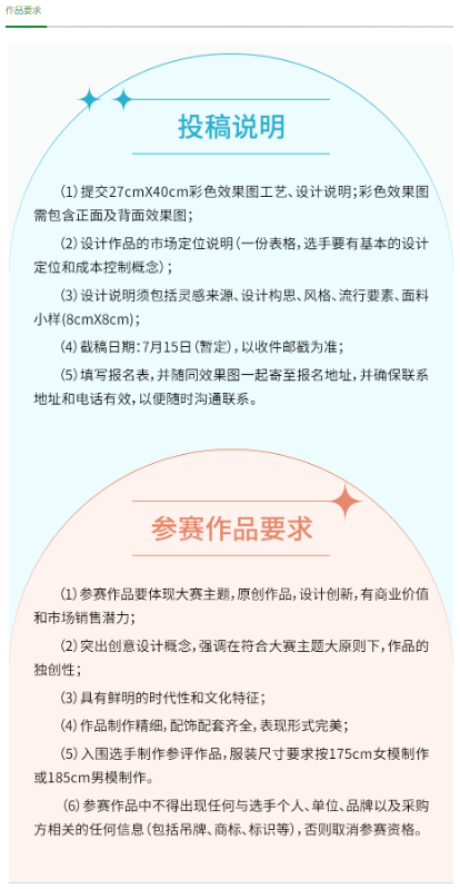 (5)入围选手制作参评作品,服装尺寸要求按175cm女模制作或185cm男模制作。