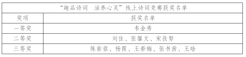 2022年下半年阅读推广活动――“趣品诗词 涵养心灵”线上诗词竞赛已经结束,感谢参赛同学们的坚持,现将比赛获奖名单公示如下: