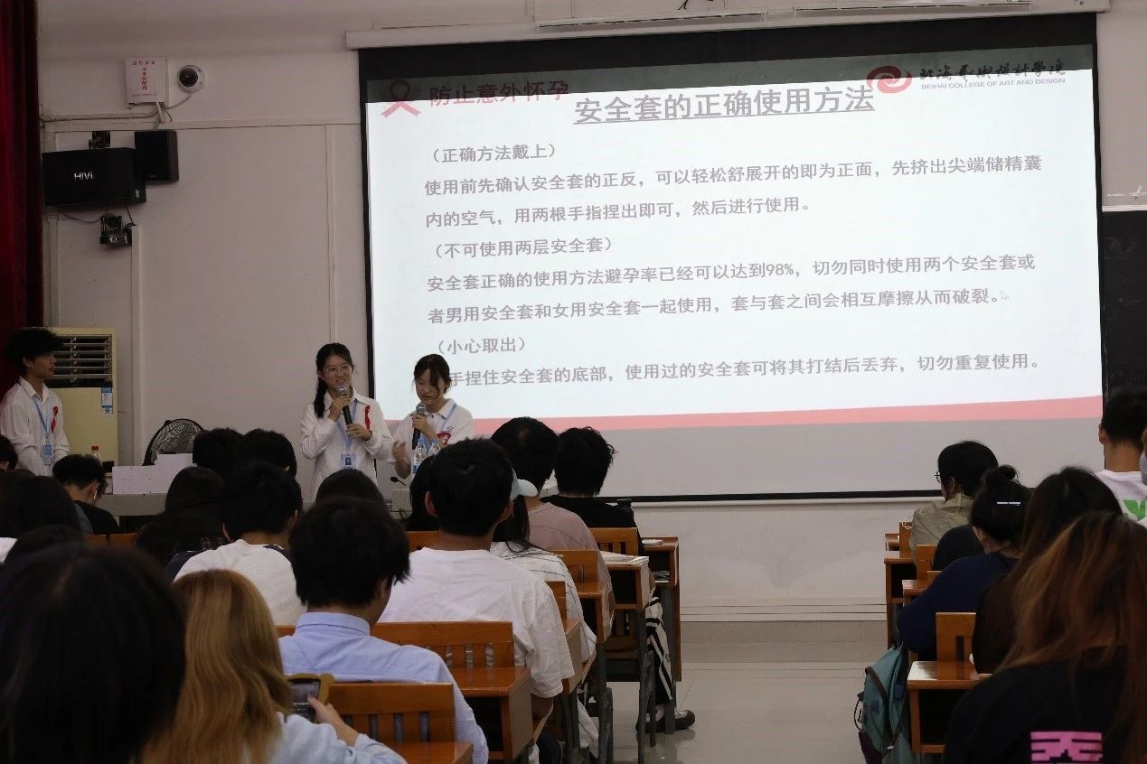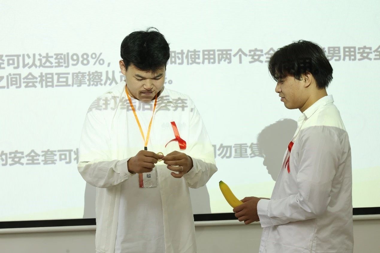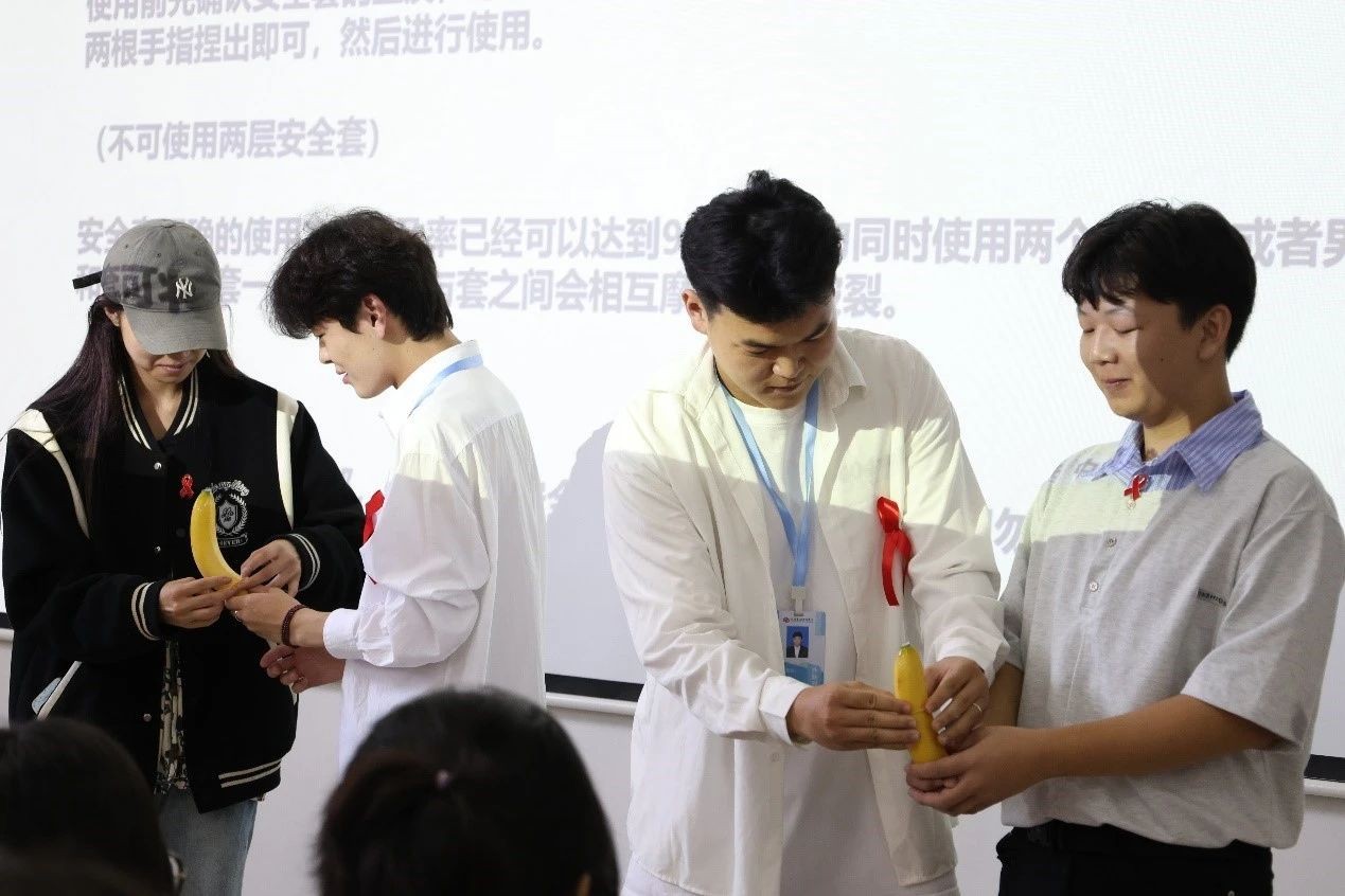除此之外,我校同伴教育主持人还为同学们讲解了安全套的正确使用方法。在主持人的带领下,大家踊跃上台展示自己的学习成果,进一步促进了同学们身心健康发展。