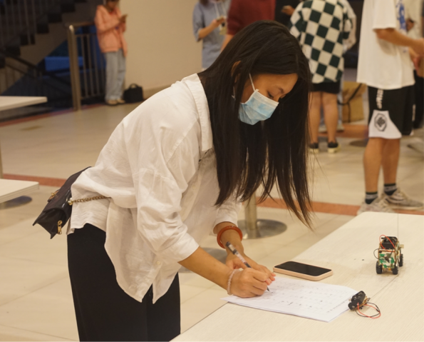 在完成木质小车组装美化赛环节后,选手们由工作人员带领着来到了赛道。每位参赛选手满怀期待的派出他们的“战车”撞击前方的障碍物,将最上方的塑料杯推倒,并遥控小车通过终点,使小车车尾通过终点。比赛进行的十分激烈,现场气氛如火如荼。