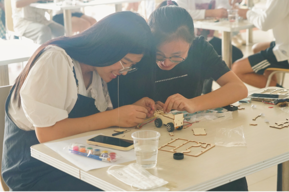 比赛开始,每组参赛选手都有一组木制小车的材料包,选手需在规定时间内(1小时)完成组装。期间需完成小车的组装及美化,时间结束停止组装及美化小车。现场的选手们都在精心制作自己的“战车”,每组都对自己的“战车”信心满满。