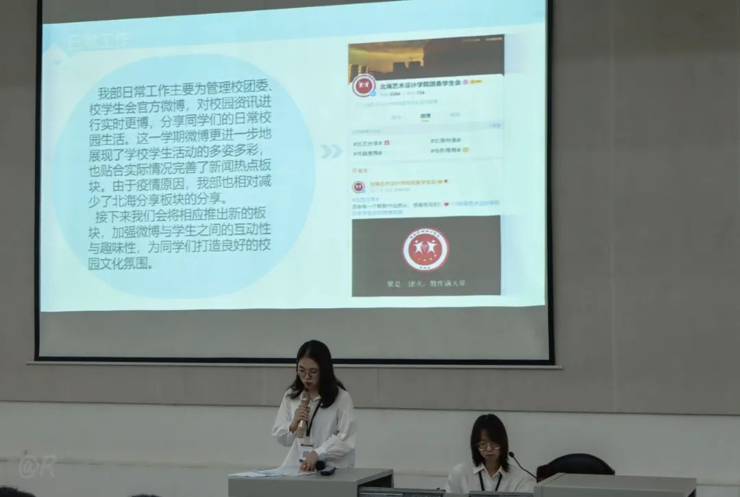 学术部成员阮梦霜主讲本学期部门的工作总结。对本学期本部门的工作做出总结,提出接下来会在校园官微相应推出新的版块,加强微博与学生之间的互动性和趣味性,为同学们打造良好的校园文化氛围。