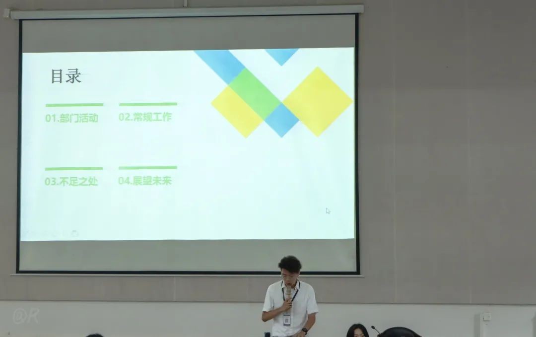 纪检部成员夏顺主讲本学期部门的工作总结。首先对本学期部门的工作及不足之处进行总结,提出部门凝聚力不足等问题,并表示在接下来的工作中对不足之处进行改进。