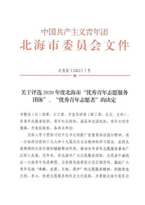 近日,共青团北海市委员会公布“优秀青年志愿服务团体”和“优秀青年志愿者”评选结果,我校团委青年志愿者协会荣获“优秀志愿服务团体”称号,校团委青年志愿者协会会长沈星宇、副会长张敏荣获2020年度“北海市优秀志愿者”称号。