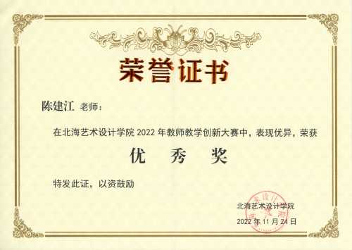 科研反哺教学,教书是为育人,精心方有成效。踏实的教学态度,经年累月的沉淀,最终将立德树人、为国育才的理念灌输到教学实践的点滴中去。培养出了一批批茁壮成长起来的优秀大学生,陈建江老师也获得了相应的荣誉。2022年,被评为北海艺术设计学院“师德标兵”称号;参加北海艺术设计学院教师教学创新大赛,荣获优秀奖。这些年,指导学生多次参加各类专业作品展览并获奖,如指导学生钟文竹参加由自治区农业农村厅举办的2021年第三届“广西稻渔丰收节”稻渔艺术作品比赛中荣获三等奖;2022年,指导学生林佳婕参加广西美术家协会举办的第二届广西工笔画作品展入选,荣获优秀奖;2021年,指导学生霍远琴创作的作品《守护·憩》,入围由中国美术家协会举办的“新征程奋进粤港澳大湾区全国中国画、油画展”。