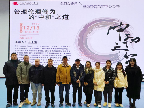 12月18日晚,广西大学公共管理学院王玉生教授应邀于我校西校区大礼堂,为广大师生带来了一场题为《管理伦理修为中的“中和”之道》的精彩讲座。讲座旨在分享管理中的“中和”哲学思想以及人生需要掌握的协调平衡思维。讲座由院长蒙绍荣教授主持。