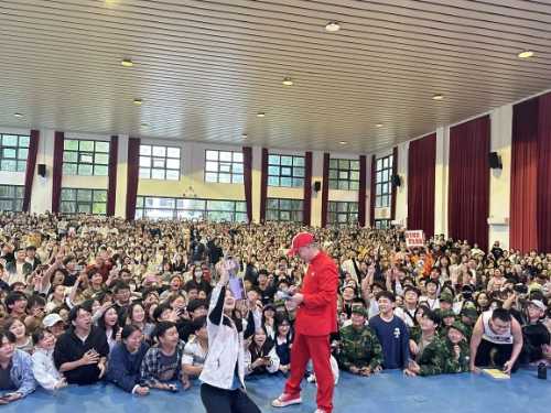为了满足同学们的合影要求,章老师走到舞台前,蹲下身子,与现场全体同学一起合影。随着潮水般汹涌的欢呼声,摄影师将章老师亲切和蔼的笑容,与同学们脸上洋溢的喜悦与激动,定格成了永恒的瞬间。合影结束后,章老师站起身来,向同学们挥手致意,感谢他们的支持。同学们以雷鸣般的掌声和欢呼声向章老师致以最崇高的敬意和感谢。