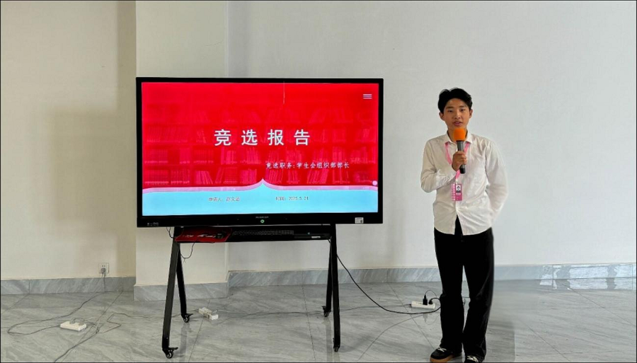 为确保竞选活动的公正性与透明度,竞选流程分为三个阶段:自主报名、教师考核、现场演讲,最终由师生代表组成的评审团综合考量候选人的工作能力、团队协作意识及创新思维等进行评选。各位候选人依次上台,围绕工作情况、工作规划等方面展开演讲,充分展现了竞选干部们积极向上的精神风貌。