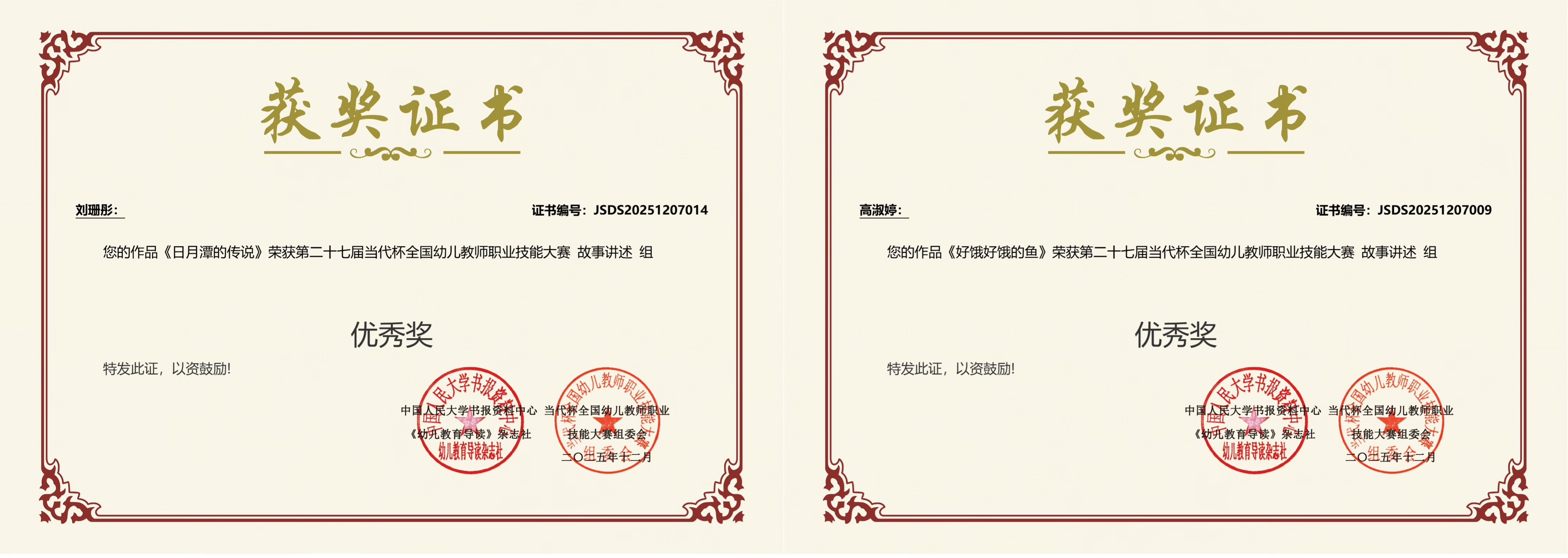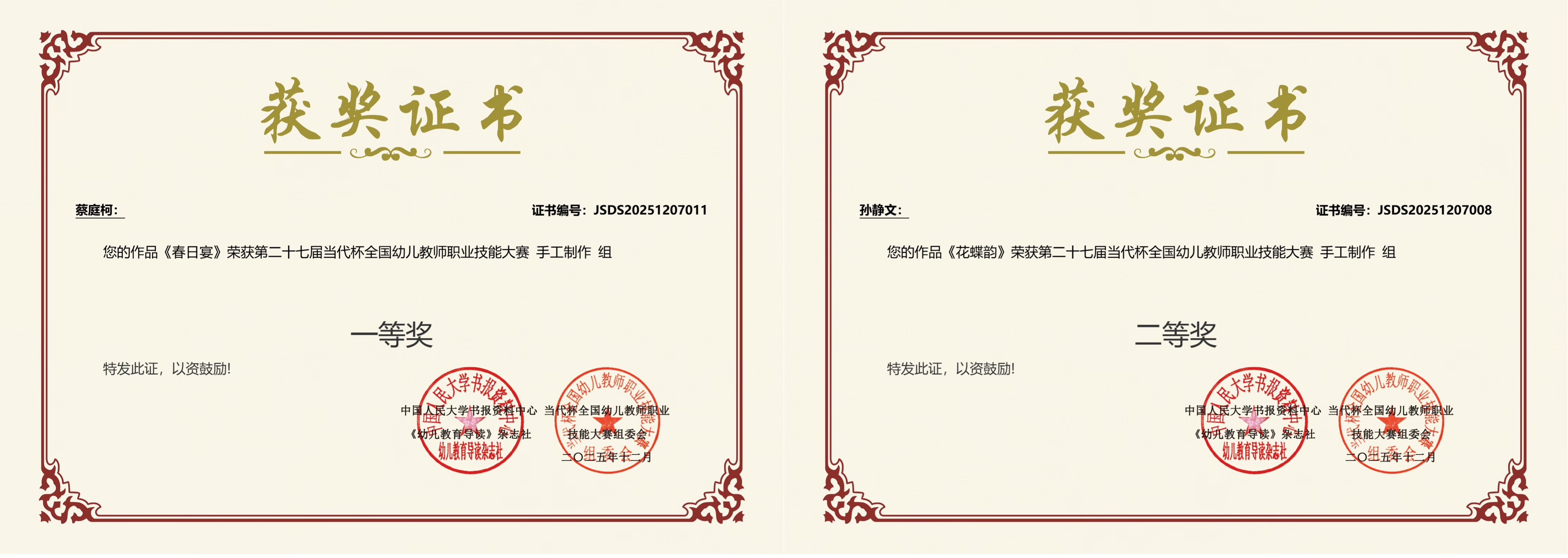 第二十七届“当代杯”全国幼儿教师职业技能大赛获奖证书