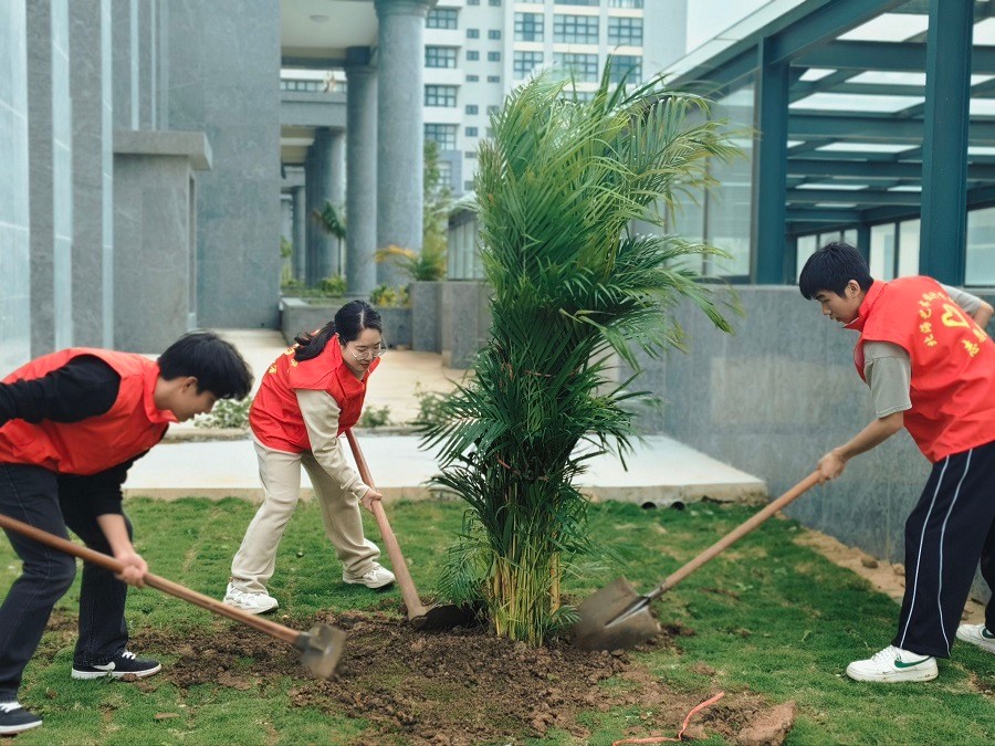植树现场暖意融融、干劲十足。师生们默契配合,挥锹铲土、扶正树苗、填土压实、围堰浇水,每一个步骤都认真细致、一丝不苟。劳作间隙,大家畅谈生态保护理念,交流校园绿化心得,将对校园的深切热爱、对绿色生态的美好向往,尽数倾注于亲手栽种的每一棵树苗之中。经过大家的辛勤劳作,一批批苗木整齐挺立、迎风吐翠,成为南校区一道清新亮丽的风景线。