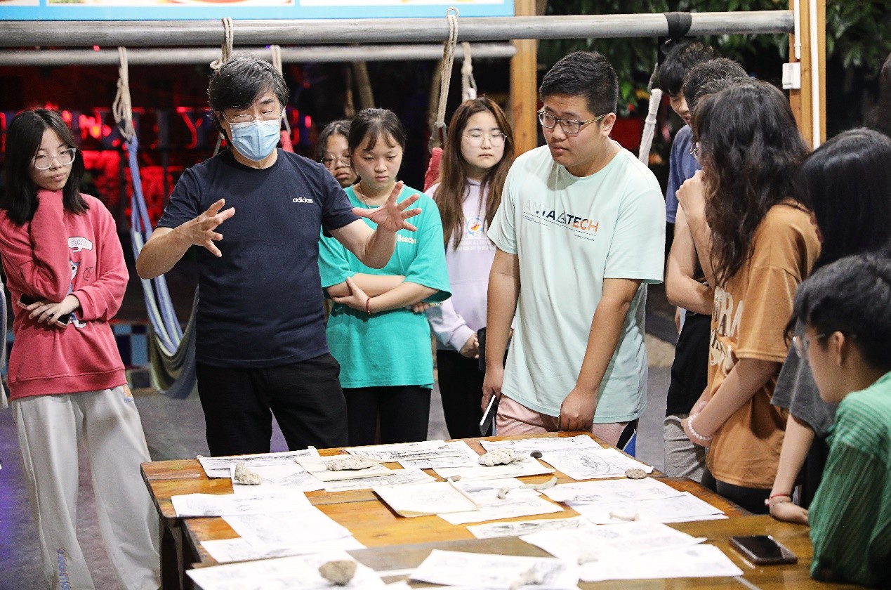 白天,在老师们的带领下,同学们有序深入景区、村庄,通过观察走访体验感悟、实地踏勘拍摄记录、艺术采风绘画写生,结合课程所学知识,感受、观察、分析涠洲岛自然风貌与人文聚落,领悟地方性色彩、空间等元素的构成魅力,并以自身理解运用美术基础与设计表现技法绘出“设计色彩”图幅。过程中,老师们悉心指导,帮助同学们了解掌握取景、构图、取舍、表现。晚上,专任教师辅助指导,教授以班级为单位开展评图教学课堂。微弱灯光抵不住同学们对专业知识学习的偌大热情,每位同学积极听取指导教授的点评意见,努力提高自身的艺术涵养与表现技法。