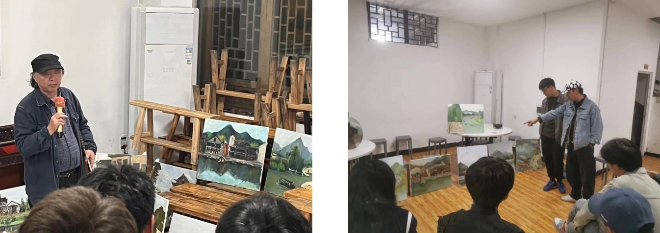 写生是一个循序渐进的过程,白天同学们在老师的带领下尽情地开展户外写生活动,感受当地自然风光风土人情晚上的习作讲评则是检验和反哺教学不可或缺的必要环节,美术学院的教师们认真负责地对每一位同学的画作进行讲评、逐一细化并给予示范指导。
