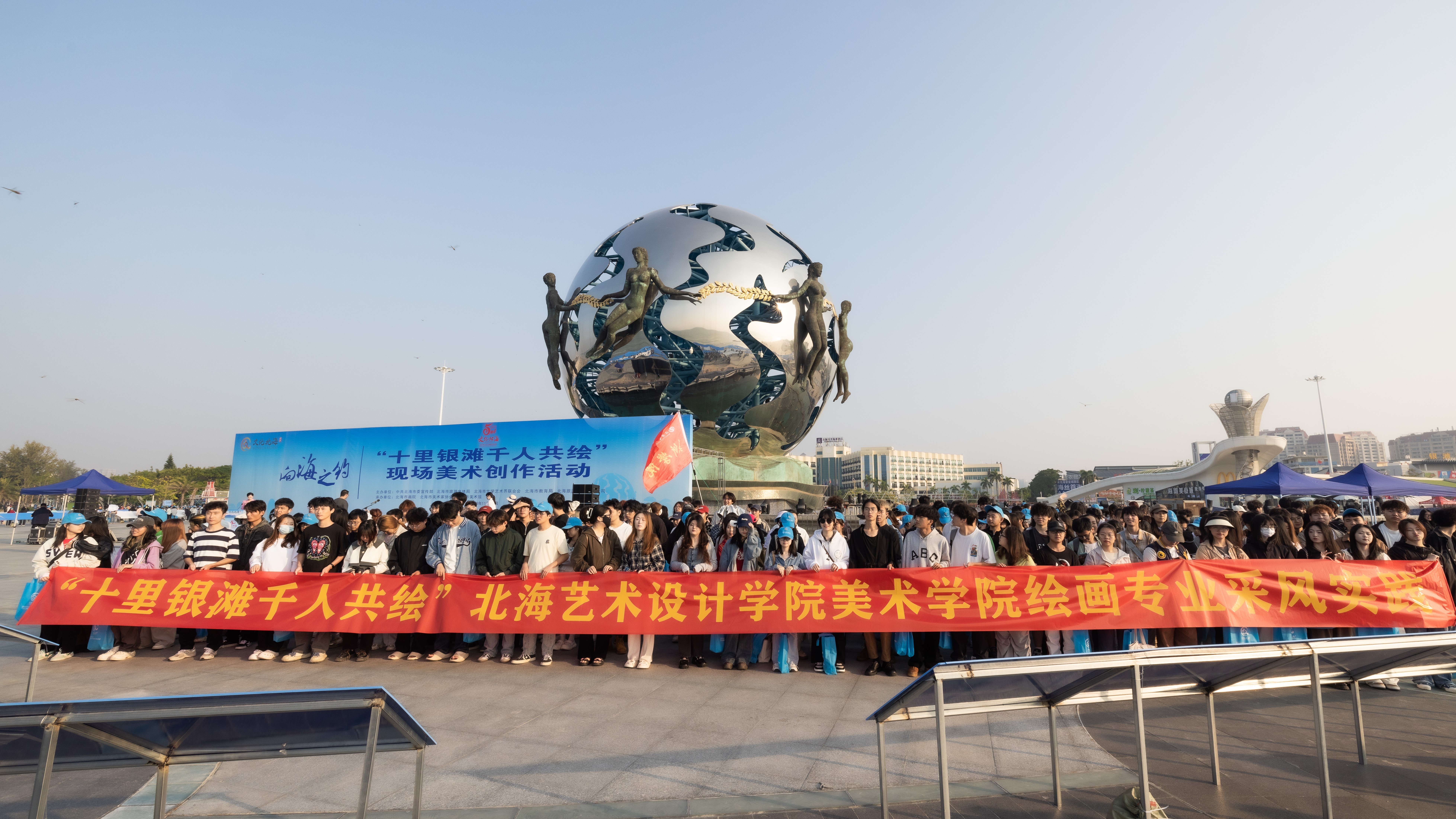 20231128日,为深入学习贯彻习近平文化思想和党的二十大精神,大力实施文化强市战略,加快“文化北海”建设,推动北海文化繁荣发展,积极配合市委市政府2023文化北海建设活动周,由我校美术学院常务副院长龚为领队、党总支副书记鲁明阳为副领队,共组织426名绘画专业学生和15名管理教师参加十里银滩千人共绘现场美术创作活动。