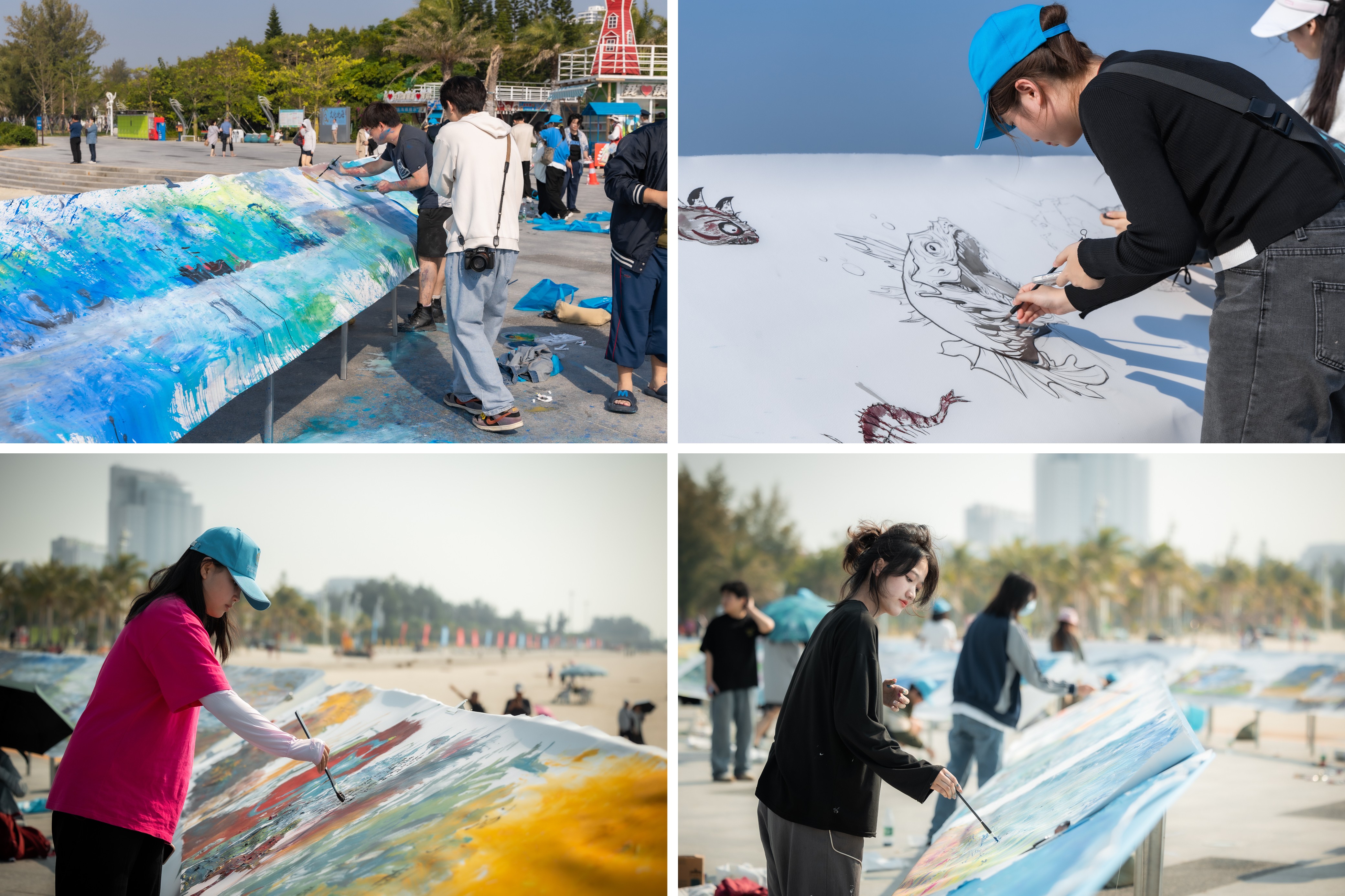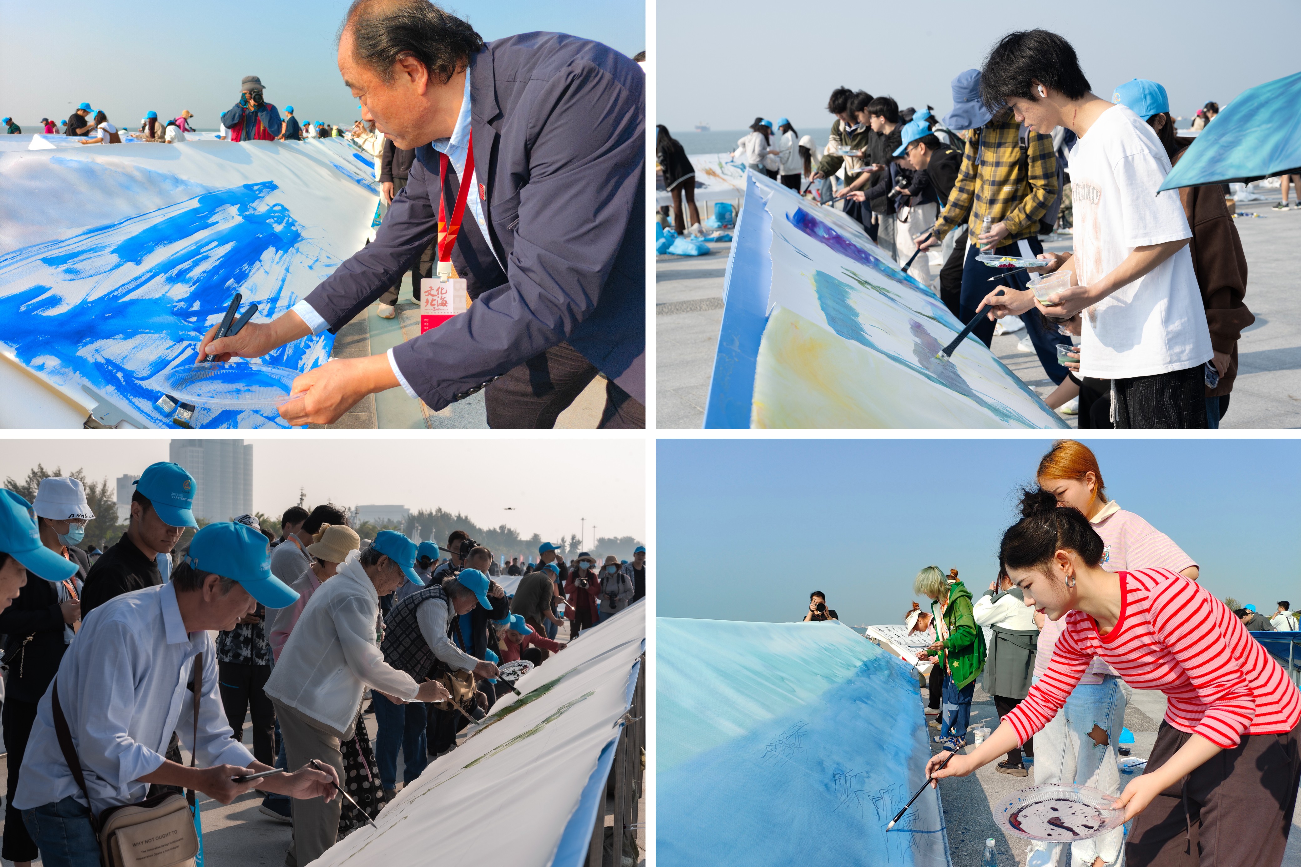 上午9时,北海市副市长李建华宣布活动启动。随后,千人齐动笔,共绘十里银滩。在创作现场,美术学院师生手握画笔,面朝大海。以十人为一组,以各自的绘画技巧和独特的创意,以他们无比的激情和活力共同绘就一幅幅10米长卷的画作。
