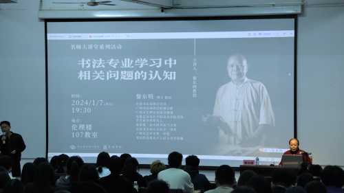 2023年1月7日晚7:30,黎东明教授于北海艺术设计学校西校区伦理楼107开展题为《书法专业学习中相关问题的认知》的讲座。本次讲座由书法学教研室主任苏乃从主持,美术学院2022、2023 级书法学专业师生参与。