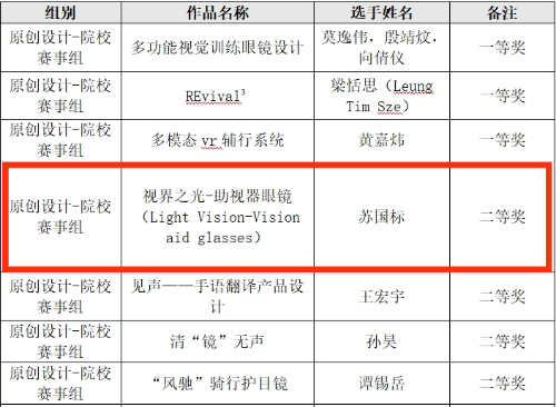 近日,2024深圳国际眼镜(智能穿戴)设计大赛暨第八届横岗眼镜设计师评选决赛在龙岗举行,大赛以“镜启未来·艺数共生”为主题。自启动以来,共征集到原创设计-院校赛事组1202份作品,经过激烈角逐,我校设计艺术学院产品设计专业2021级学生苏国标参赛作品《视界之光-助视器眼镜》在此次大赛中脱颖而出,荣获二等奖(指导老师:邓渠成)。