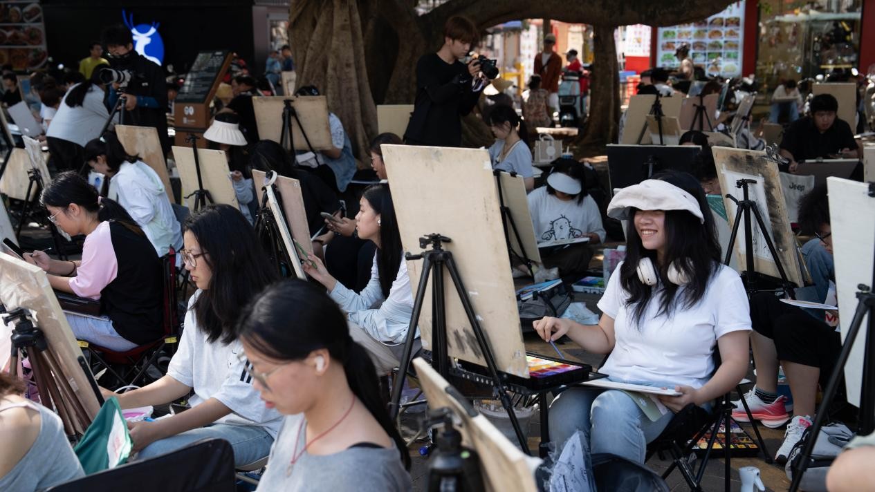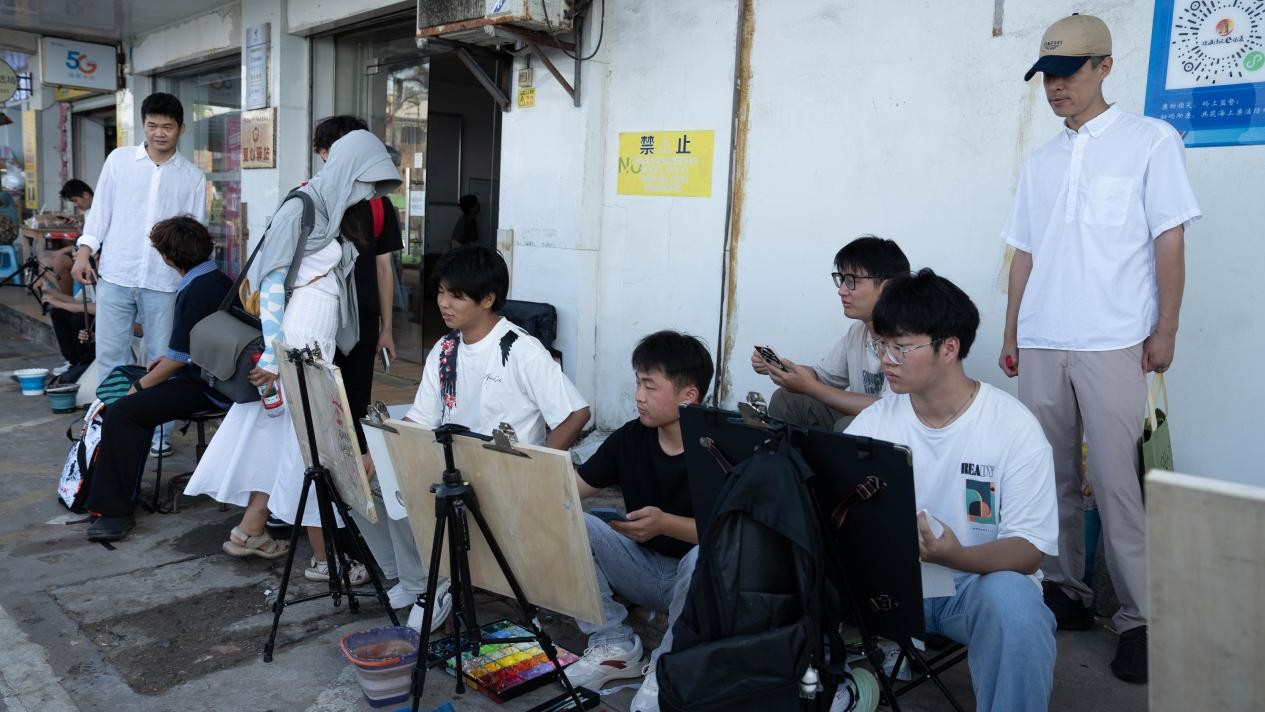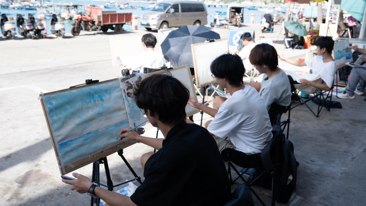 随后,队伍转至充满渔港风情的南湾码头,同学们将上午激荡的情感转化为创作动力,用画笔描绘碧海蓝天与渔船繁忙的景象。