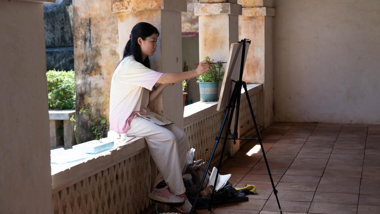 14日,实践课程正式进入核心写生阶段。师生们前往具有百年历史的涠洲岛天主教堂。在这座融合了珊瑚石砌筑工艺与哥特式建筑风格的独特场域中,同学们架起画板,展开画纸,全神贯注地将历史的厚重与建筑之美转化为笔下的线条与色彩。