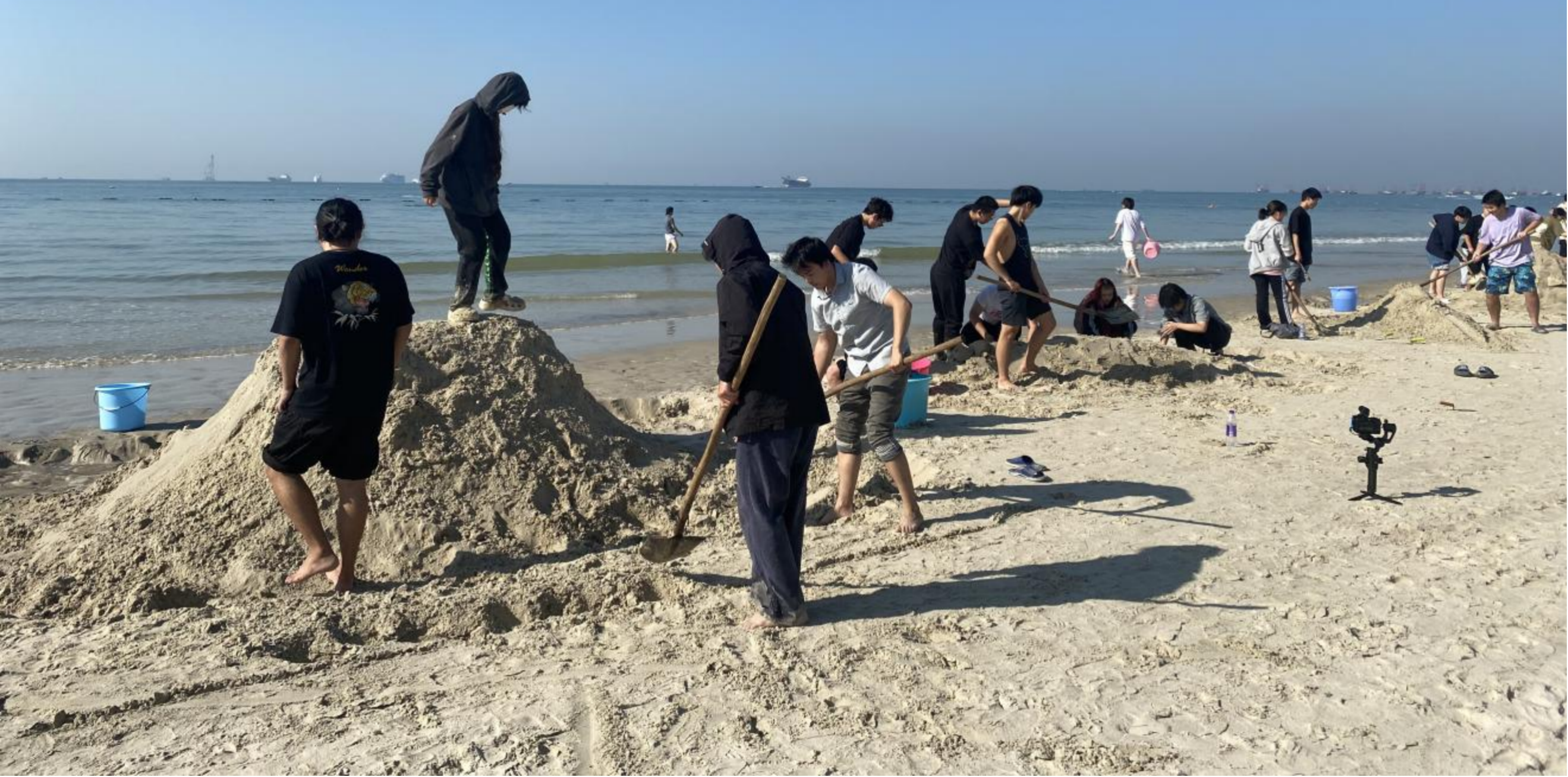 12月30日,为弘扬传统沙雕艺术文化,提高艺术审美与实践教学的综合结合力,美术学院雕塑教研室组织24级雕塑学生在北海银滩举行沙滩教学实践活动。挖掘区域文化元素加以综合创作,让艺术实践服务于美丽的北部湾,让沙滩艺术创作与海滩美景共放光彩。