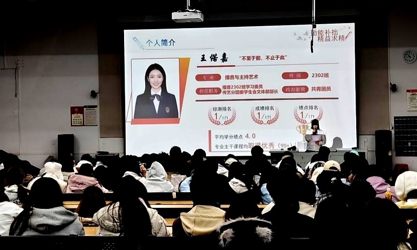 分享环节中,学子代表结合自身核心经历展开深度分享:数媒2210班马俊广以退役士兵与大学生创新创业项目核心成员的双重身份,畅谈军旅精神如何赋能学业规划;数媒2209班梁杰聚焦“非天赋型学生的专业进阶”,从技能积累、学习方法优化等方面拆解成长逻辑;数媒2210班高子悦结合团委工作与考研备考的双重经历,系统拆解多任务并行的时间管理矩阵,分享高效平衡学业与工作的实用技巧;同班李宏杰以创业先行者的视角,复盘从兼职试水到自主创业的全流程,为有实践意愿的新生提供清晰指引;数媒2209班纪欣宇围绕“兴趣-专业-考研”协同发展展开分享,剖析兴趣驱动专业深耕的内在逻辑;数媒2307班高新宜带着多项专业竞赛获奖经历,分享备赛策略与专业能力打磨心得,展现青年学子的拼搏风采;此外,专业课成绩优异的跨界学习者及播音2302班王偌嘉,分别从跨学科学习、专业技能精进等维度补充经验,全方位呈现了“优秀”的多元形态,让新生深刻理解“大学成长没有固定模板”。