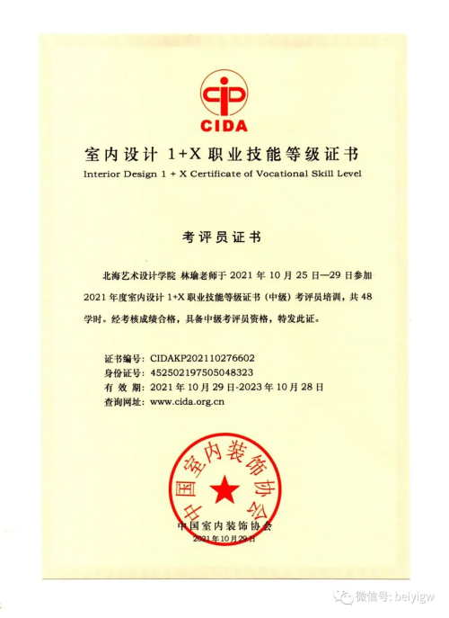 2021年10月我校建筑与环境艺术学院被遴选为全国1+X室内设计职业技能等级证书2021年度第一批考核站点。为落实相关工作安排,我校选派两位教师参加由中国室内装饰协会主办2021年度全国室内设计1+X职业技能等级证书师资及考评员培训(广西站),并通过师资及考评员考核。