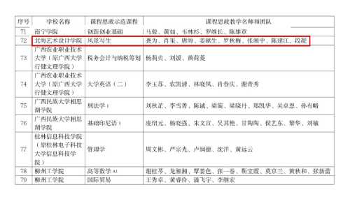 近日,根据《自治区教育厅关于公布2021年普通本科高校课程思政示范课程名单的通知》(桂教高教〔2021〕59号),北海艺术设计学院美术学院《风景写生》被教育厅认定为2021年自治区级课程思政示范课程。龚为、肖玺、唐海、罗秋梅、张湘中、陈建江、段凝老师获得自治区课程思政教学名师称号,并获思政教学团队称号。这是我校在自治区级课程思政建设上的新突破。