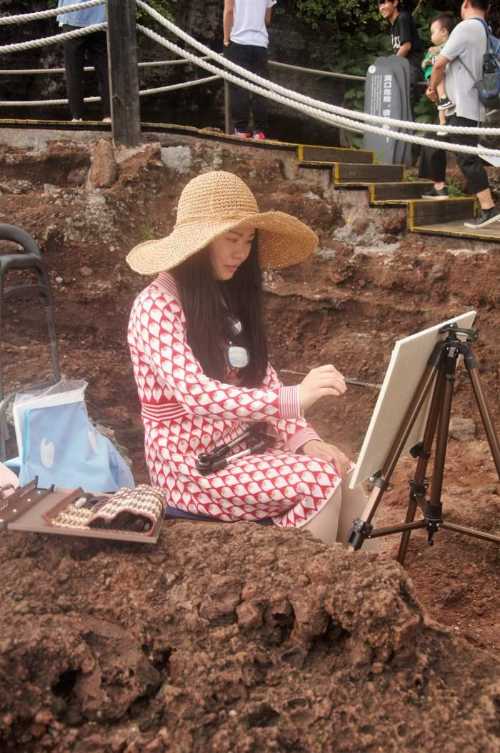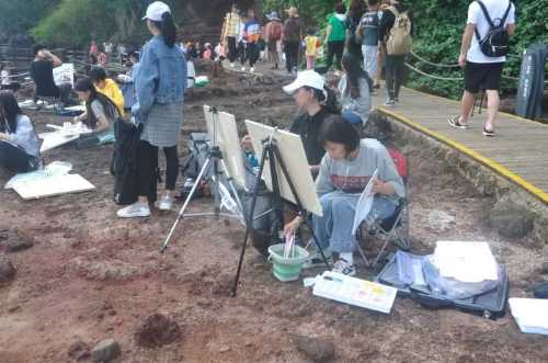 鳄鱼山公园是由火山喷发的熔岩所形成的天然景观,湛蓝的海水,赤红的火山岩礁石,再加上彰显岛屿风格的木头栈道,这一切新鲜的景象给师生们瞬间带来了无限的灵感,全体师生在大自然的鬼斧神工之下开始了对自己作品的构思并开始挥舞画笔。