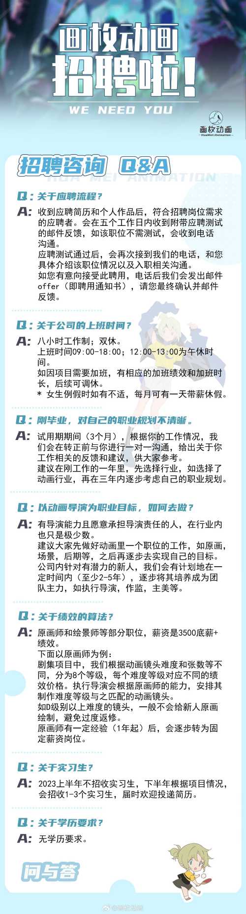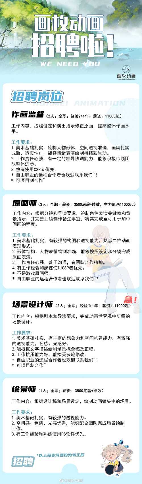 画枚动画招聘啦~(商务合作等请联系QQ:3561756733)最近两年都在长篇原创项目的制作中,期待你的加入,让我们一起来做动画吧!长年招聘~(只要微博没删就一直在招人。)