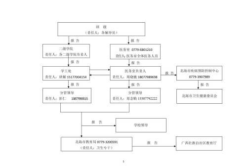 (五)学校各部门发现传染性疫情和公共卫生突发事件时,应于第一时间报告给医务室,医务室按规定处置并配合北海市疾病预防控制中心专业人员进行调查、采样、消毒和处理。
