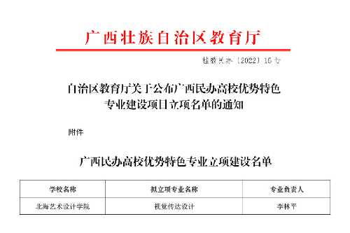 近日,广西壮族自治区教育厅下发《自治区教育厅关于公布广西民办高校优势特色专业建设项目立项名单的通知》(桂教民办〔2022〕15号),公布了2022年度广西民办高校优势特色专业立项建设名单。我院视觉传达设计专业入选。