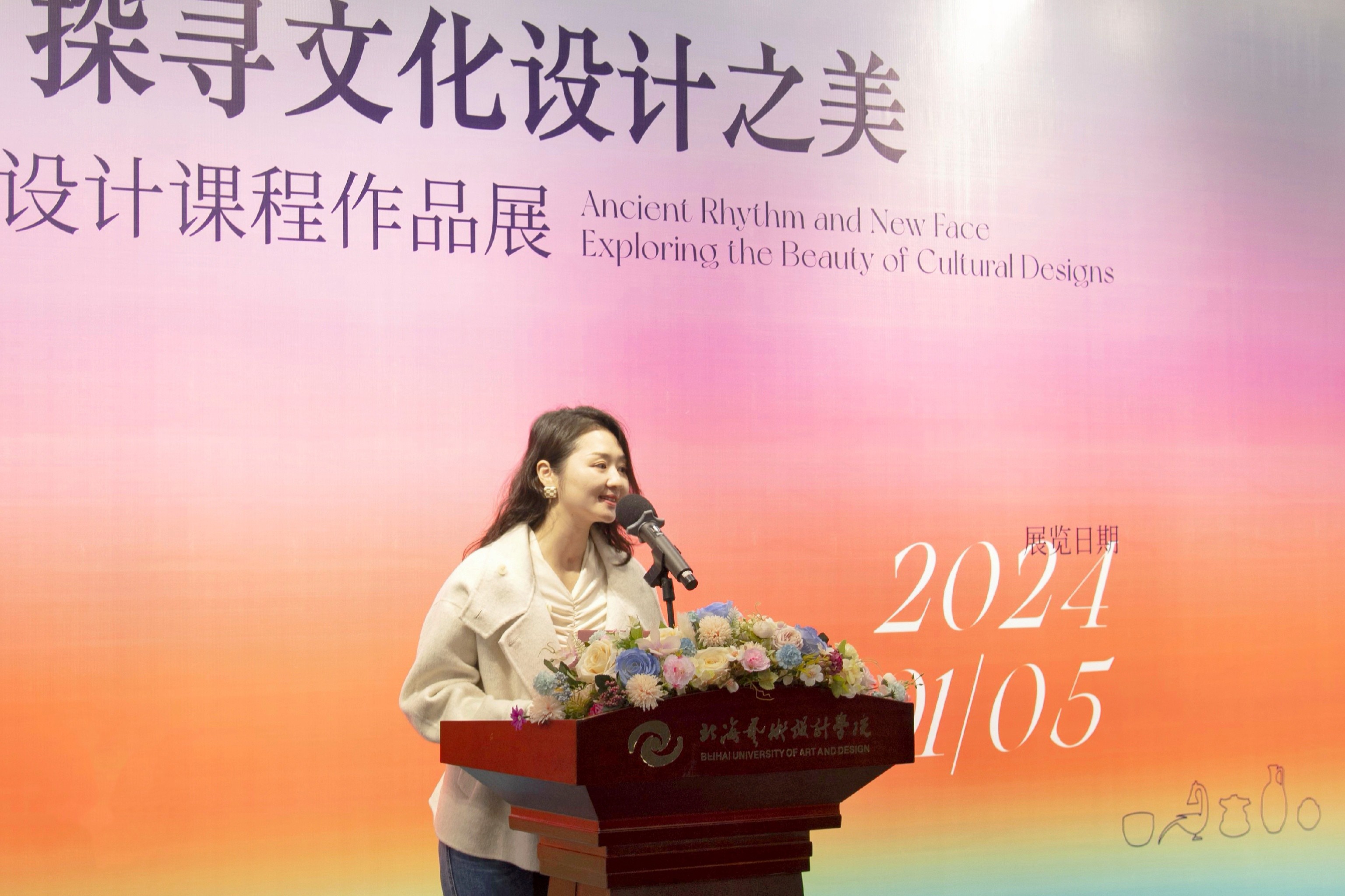 《文创产品设计课程》主课教师吴慧霞在发言中对莅临开幕式的领导、嘉宾表示欢迎和感谢,并从展览的主题、课程教学、课程思政、校企合作、课赛结合等方面进行了总结。她表示“古韵新颜”文创产品设计课程展不仅是同学们创意与技艺的结晶,也是对传统文化、海丝精神的传承与创新,更是专思融合的深度探索与实践。